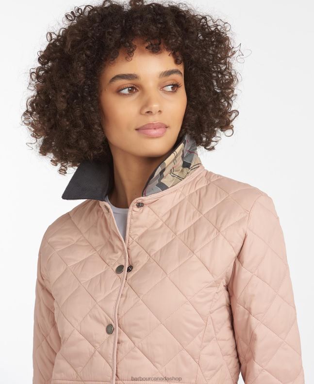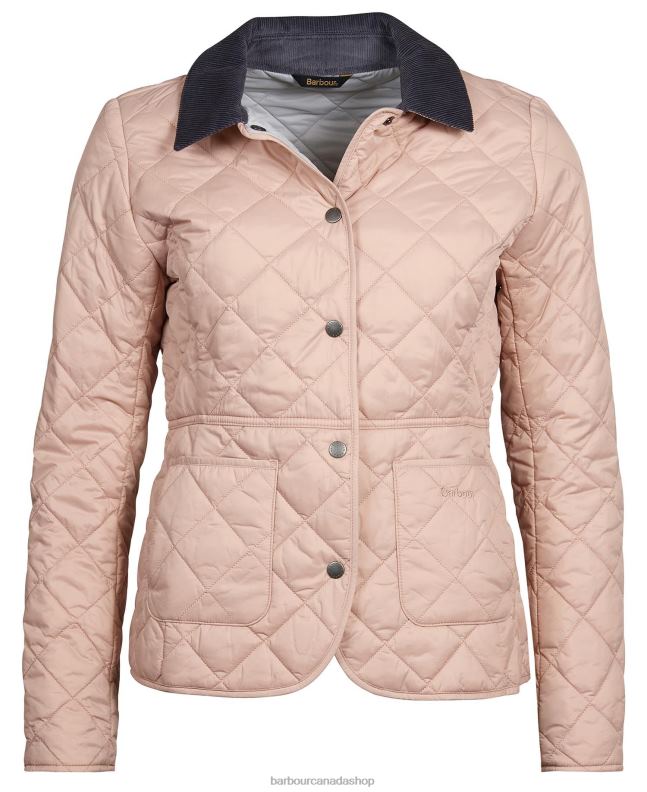 The Barbour Deveron jacket is box quilted with a corduroy collar and a feminine contrast lining. It features two practical patch pockets to the front and embroidered Barbour branding for an authentic touch.